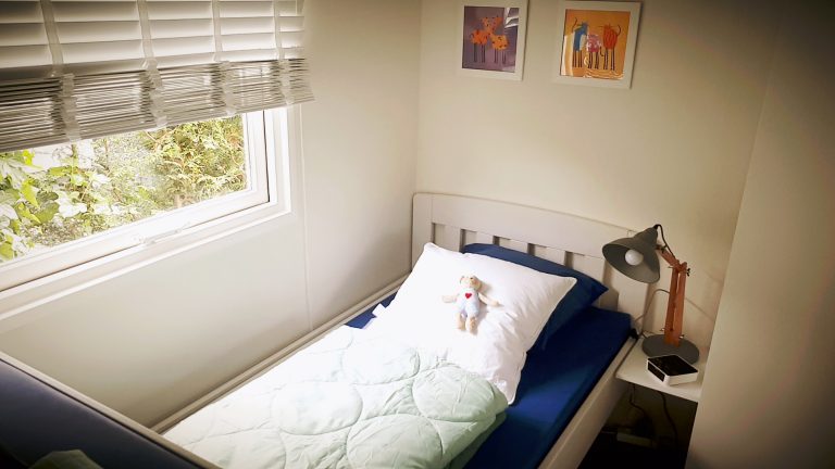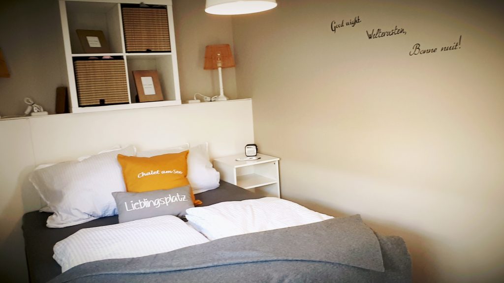 Im kleineren Schlafzimmer befinden sich zwei Betten, eins davon ist ein Hochbett. Das Bett auf dem Foto hat die Maße 100 x 200 cm, während das Hochbett die Maße 80 x 200 cm hat.