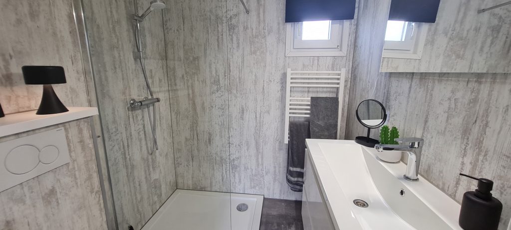 Das neuwertige Badezimmer bietet eine extra große Dusche mit viel Tageslicht durch ein großes Fenster.